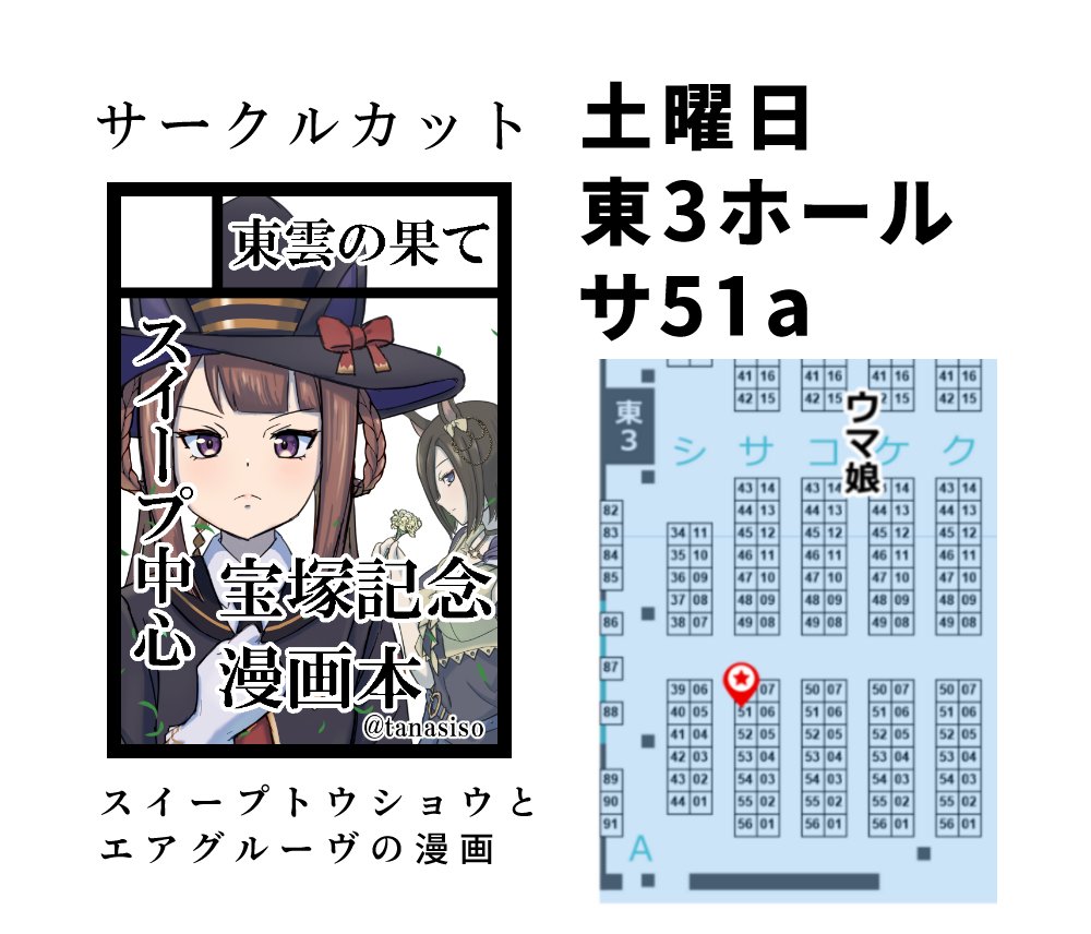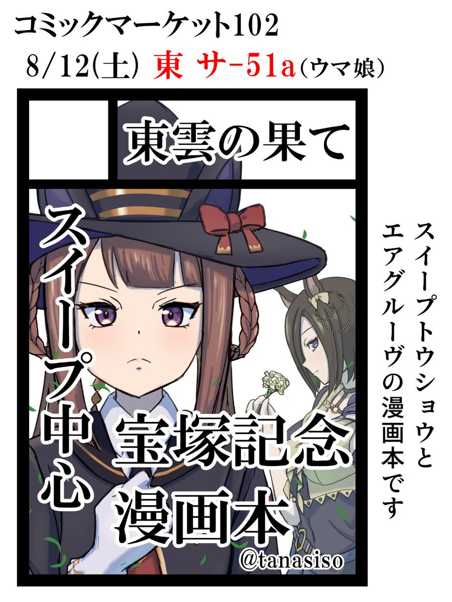 あなたのサークル「東雲の果て」は、コミックマーケット102で「土曜日 東地区 “サ” ブロック 51a」に配置されました!コミケWebカタログにてサークル情報ページ公開中です! webcatalog.circle.ms/Perma/Circle/1… #C102WebCatalog スイープトウショウとエアグルーヴの本出す予定です!よろしくお願いいたします!