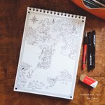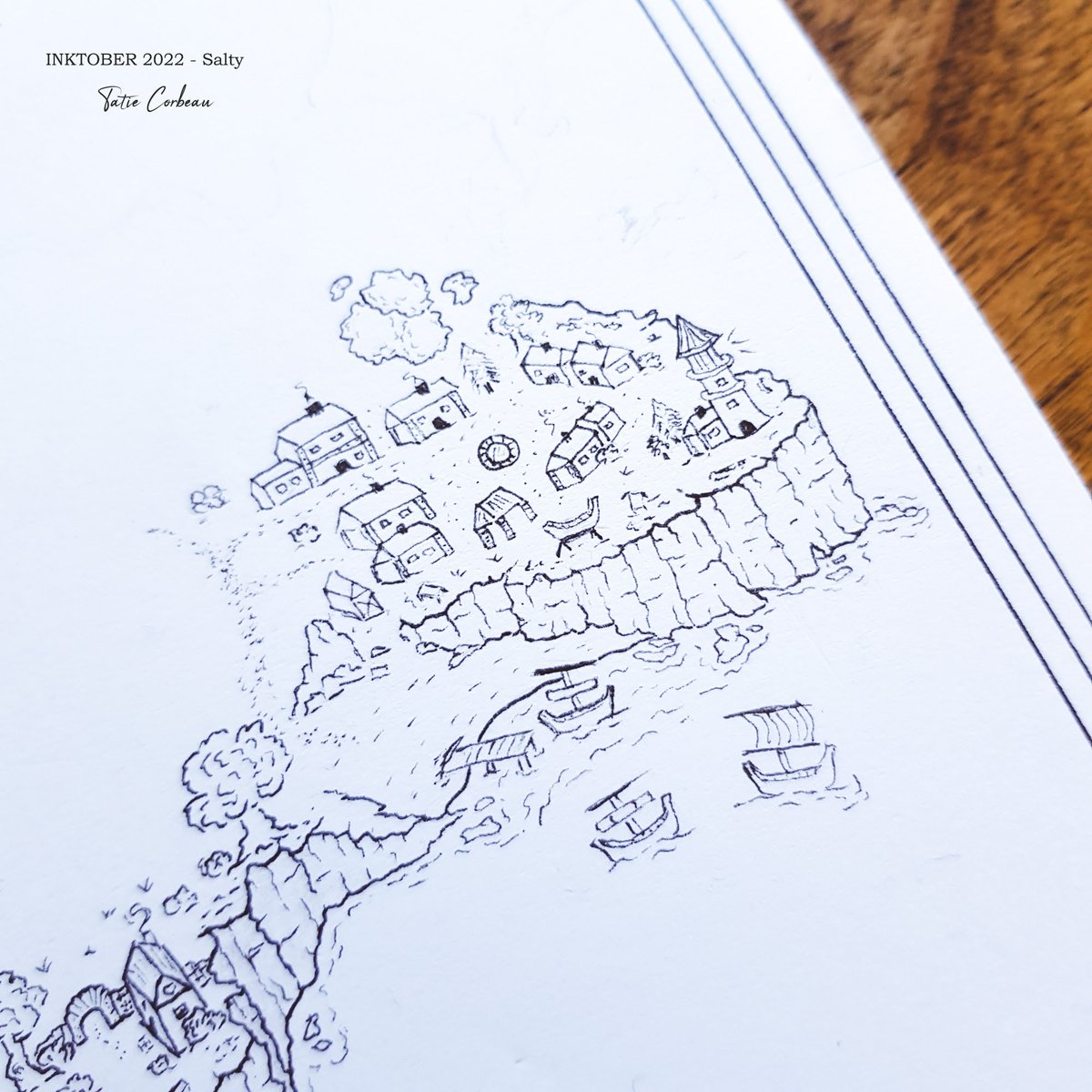 #inktober2022 Day 17 #salty "La mer peut-être aussi dangereuse que généreuse ! C'est pourquoi les bateaux de pêche sont nombreux à partir du port du village d'Amicia dans l'espoir de ramener du poisson qu'ils vendront un bon prix sur le marché." #inktober2022day17 #map #dndmap
