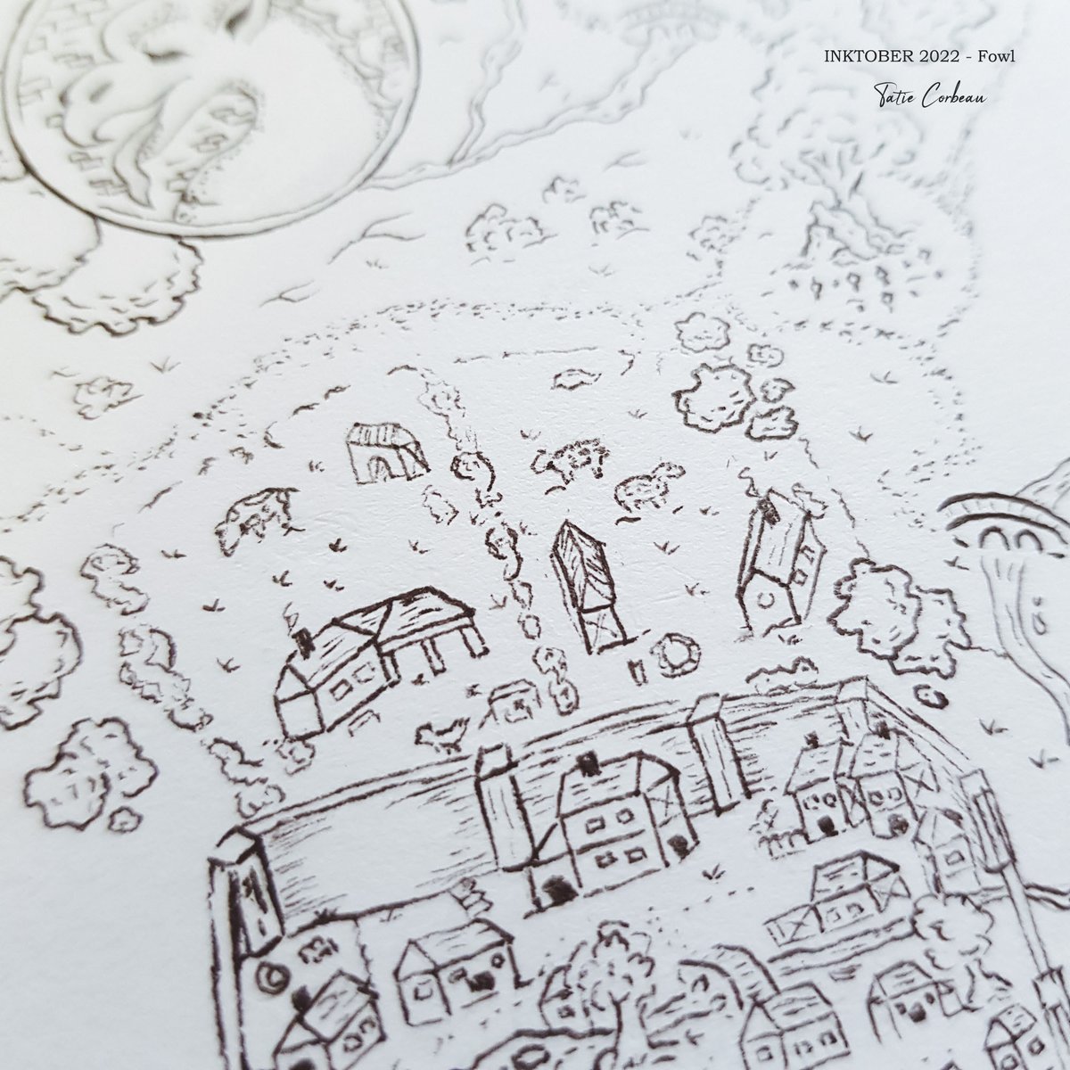 #inktober2022 Day 16 : #fowl "Au fil des routes, vous ne manquerez pas de rencontrer les animaux des éleveurs du coin. Vaches, chevaux ou licornes se partagent les prés et les cours d'eau. Attention aux volailles en liberté, elles ont tendance à défendre leur territoire." #map