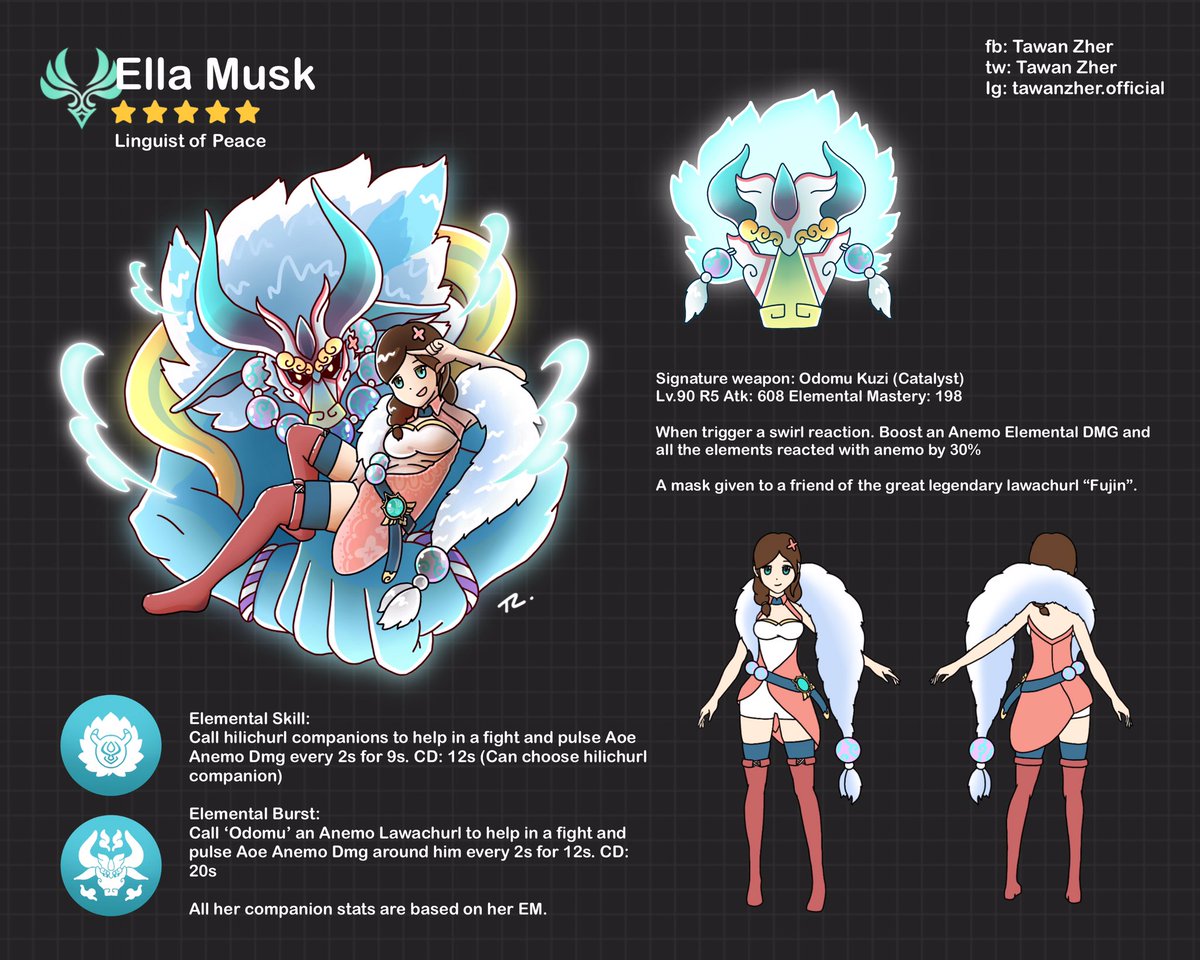Ella Musk has always been one of my favorite character. I imagine her growing up studying hilichurlian lore and ended up bounding with a legendary Lawachurl on a quest to stop war between human and hilichurl. ✌️😁 #Tawanzher#EllaMusk#GenshinImapact#genshinimpactfanart