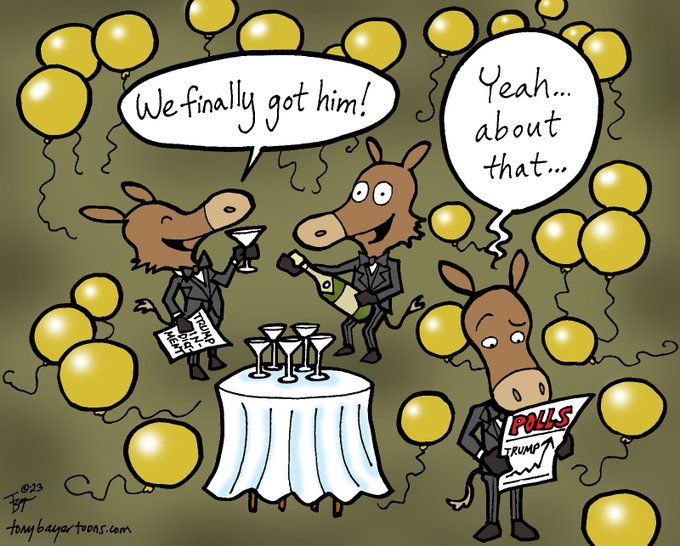 The more he looks like a victim, the more his base is convinced it's a conspiracy and his numbers strangely go up. Something to consider. #cartoon #art #drawing #illustration tonybayertoons.com/2023%200618%20…