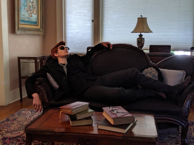 I wonder what book they are reading? Any clues @neilhimself ? Cant wait for season 2 of #goodomens it brings me joy every day #aziraphale is @MajorTomboy #goodomensprime #cosplay #crowley #readingisimportantAziraphalesaidso