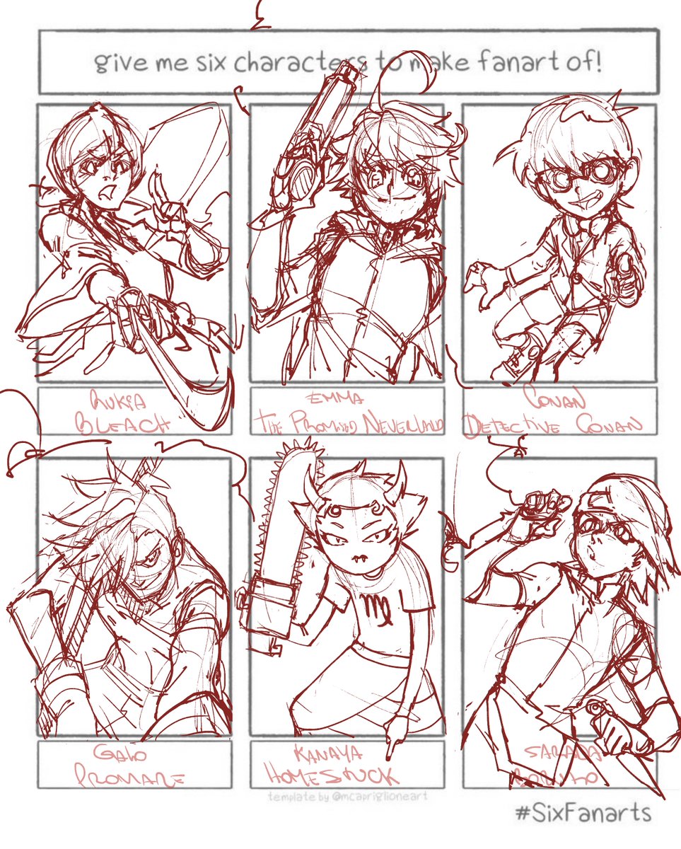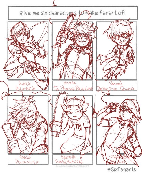 En vista de la contractura que tengo voy a subir primero los bocetos. Parte 1 #Rukia - #Bleach #Emma - #ThePromisedNeverland #Conan - #DetectiveConan #Galo - #PROMARE #Kanaya - #Homestuck #Sarada - #Boruto #SixFanarts