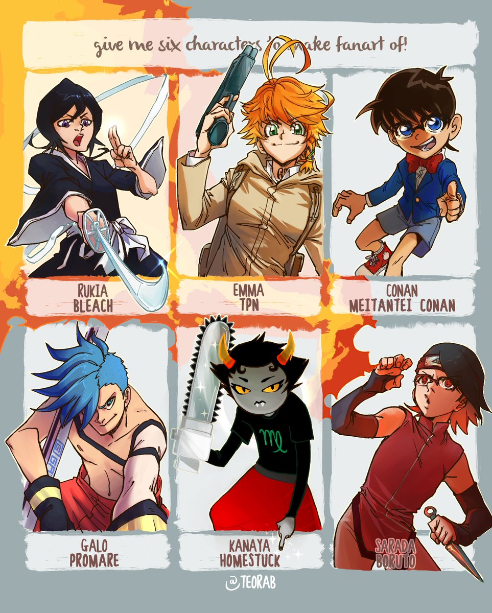 PRIMER BLOQUE (6/12) #Rukia - #Bleach #Emma - #ThePromisedNeverland #Conan - #MeitanteiConan #Galo - #PROMARE #Kanaya - #Homestuck #Sarada - #Boruto #SixFanarts #SixFanartsChallenge