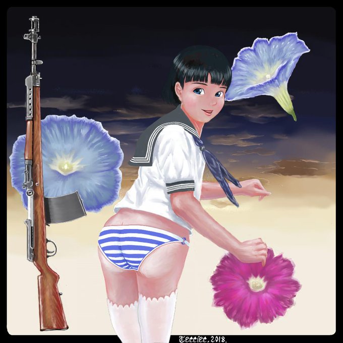 2 17 夏服に朝顔に自動小銃。過去絵です。😋💦 23/08/07 15:24