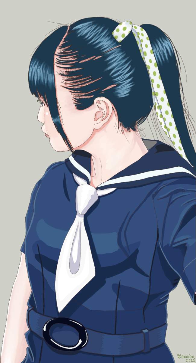 東京家政大学附属高校の旧夏服です。現在は白地に青の1本線のセーラー服になってます。旧夏服も涼やかなデザインでした。ベルトがあるのが昭和的でツボです。過去絵です。😋💦