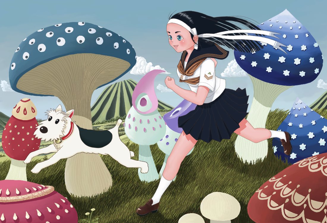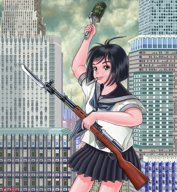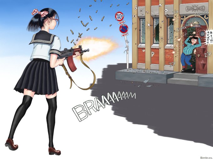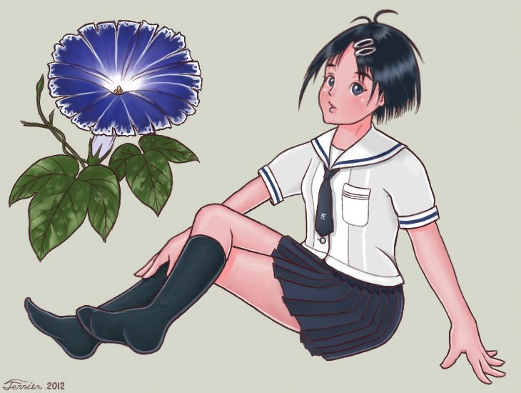 夏服に朝顔に自動小銃。過去絵です。😋💦