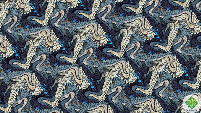13 55 モンハンのラギアクルスでテセレーション作成(IH7)。 亜種と希少種も一緒に模様にできました。 #イラスト 21/12/18 20:00