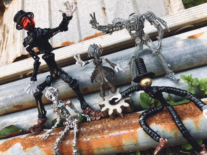 #6月になったのでフォロワーさんに自己紹介しようぜ 針金で人形を作っています。大体1ヶ月に1人のペースで完成します。 画像は直近の4人です。