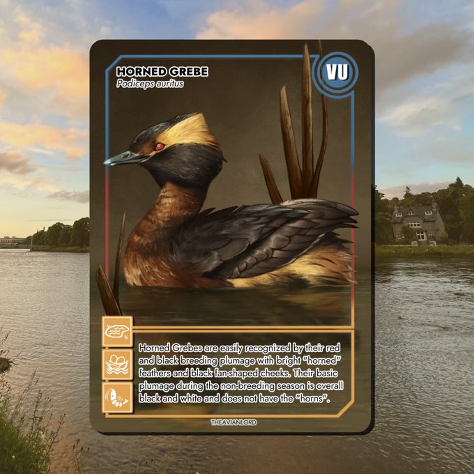 #avianaugust day 3 Horned Grebe Horned Grebes are easily recognized by their red and black breeding plumage with bright "horned" feathers and black fan-shaped cheeks. Their basic plumage during the non-breeding season is overall black and white and does not have the "horns".