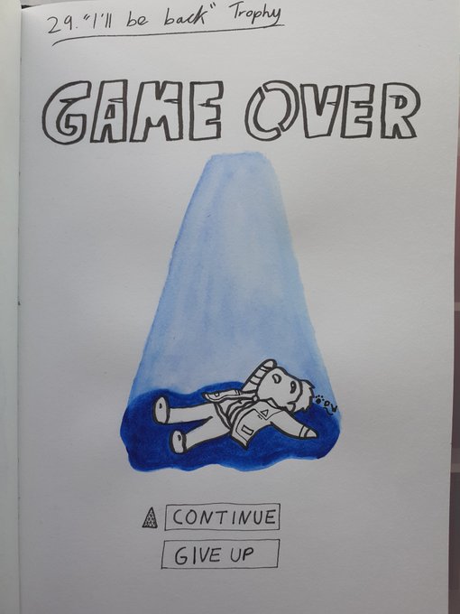 Day 29 of #DechartInktober, "I'll Be Back" Trophy. Since this involves getting Connor killed a bunch of times for trophy, I like to imagine a 'Game Over' screen appears for him every time. 😂 #Inktober2019 #DetroitBecomeHuman @BryanDechart @AmeliaRBlaire