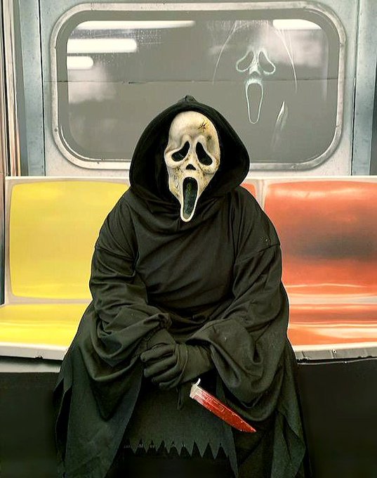 Anyone care to accompany me on subway train ride around New York City? It will be such a bloody good time you'll Scream! 😱🔪 🚇 #Scream #Ghostface #ScreamMovie @ScreamMovies #ScreamVI #Scream6 #SeeScreamVI #Cosplay