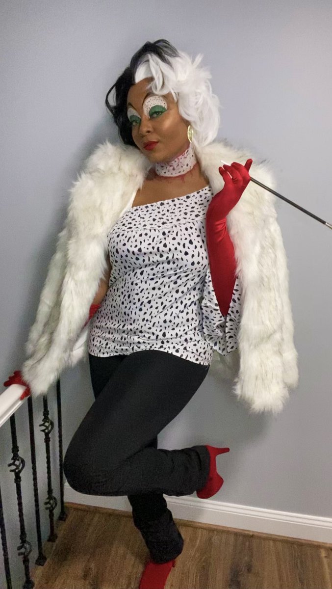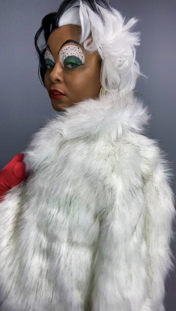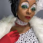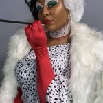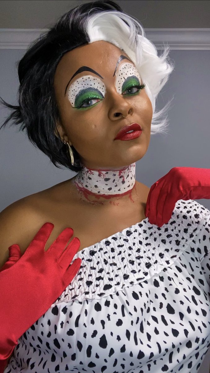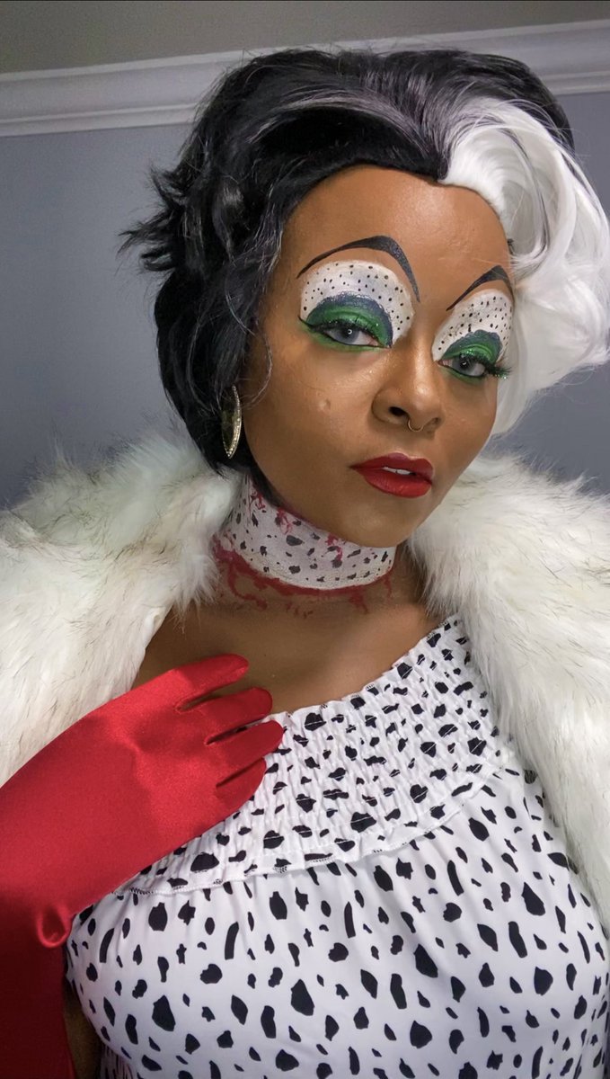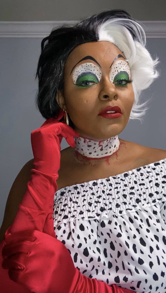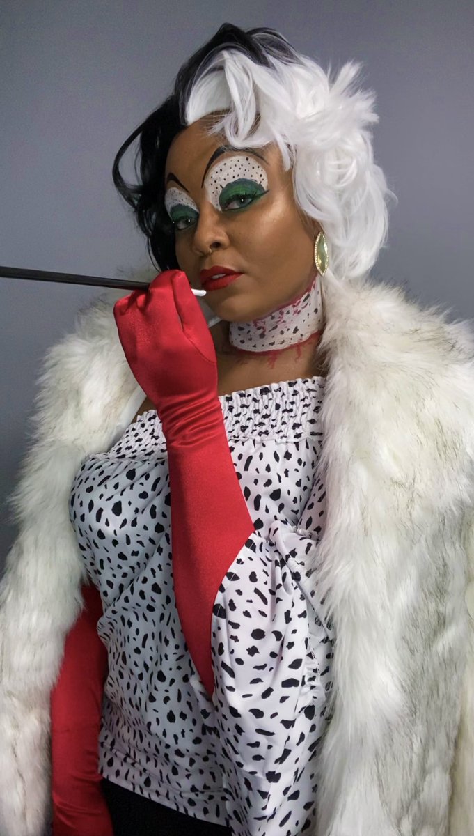 This is my first time doing body paint / big makeup, don’t let it flop ! Lol #CruellaDeVil 👠🖤🤍🩸 #31DaysOfCosplay #Blacktober #TheGreatCosplay #BlackCosplayerHere #CurlyCosplay #PlusSizeCosplay #WOCCosplay #BestCosplay #Cosplay