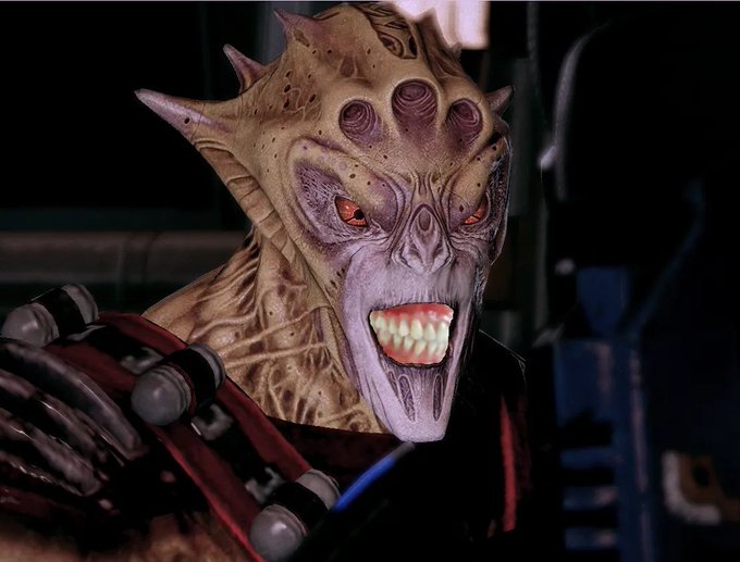 ...so @soylentcosplay was streaming and i was talking about how cursed Vorcha with human teeth would be... so jere is a 30 sec photoshop of one of my most cursed creations #masseffect#stream#cosplay#vorcha#badphotoshop