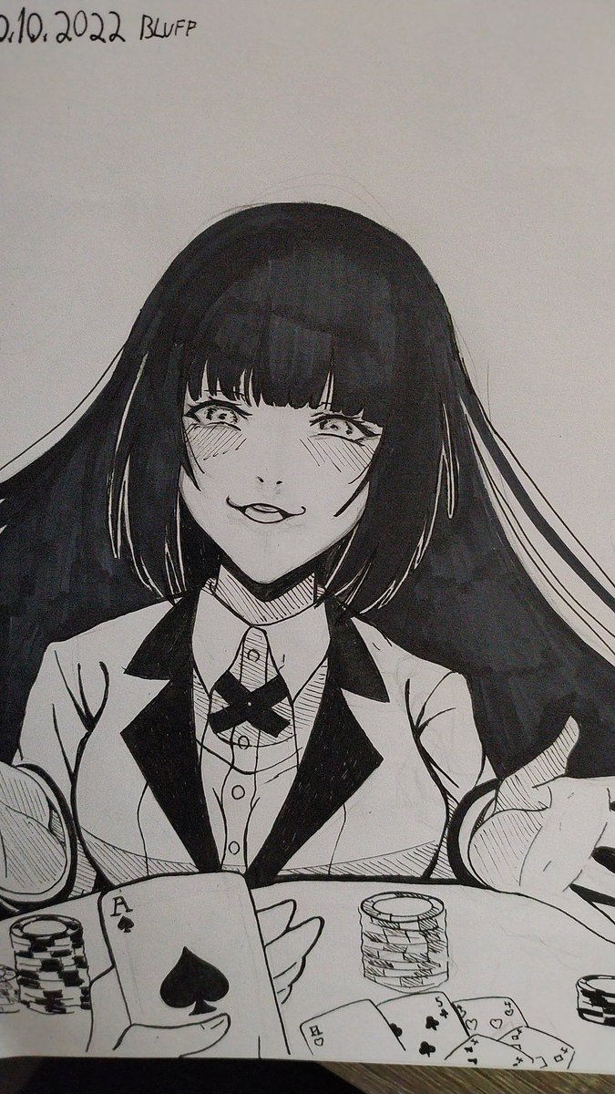 For yesterdays #inktober we got prompt bluff. And I thought ah yes gambling. From #kakegurui we got Yumeko! Just caught you cheating>:) #inktober2022 #inktoberbluff #fanart