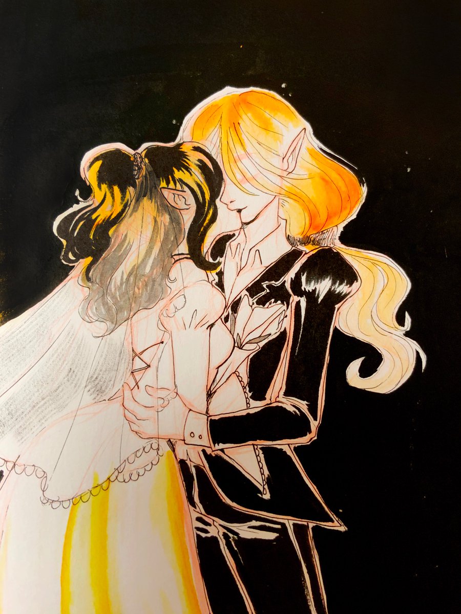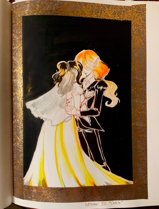 Inktober day 30 catch Saw the prompt and wanted to wrap up my little vampire story and a little announcement; I got engaged! and I hope that’ll be me and my fiancé this time next year! 🖤🧡💛🖤 #inktober2019 #inktober #wedding #vampires #vampress #vampirewedding #engaged #gothic