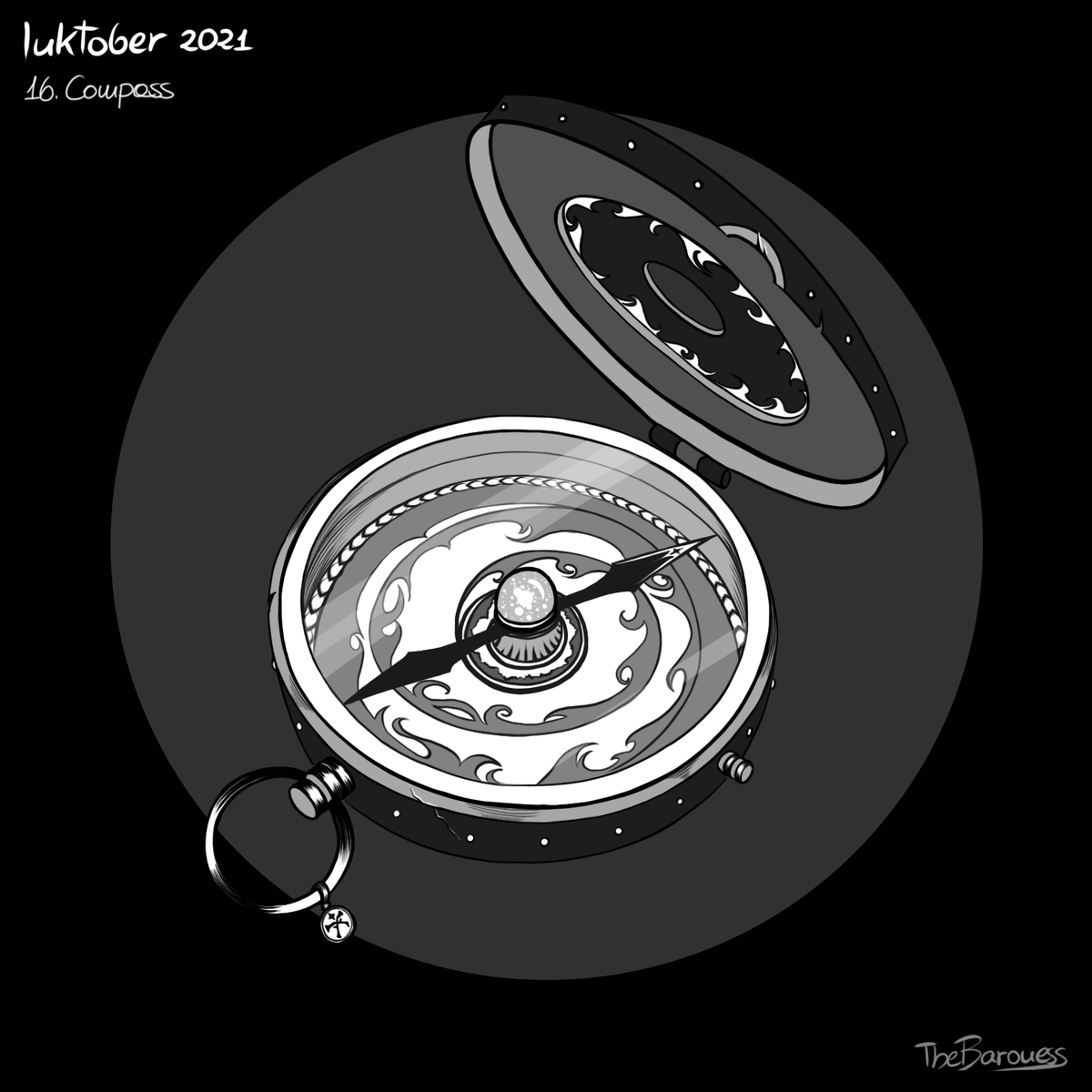 #inktober2021 Day 16: Compass A Wayfinder is always something pretty useful to carry around as an adventurer, isn't it? #ArtistOnTwitter #inktober #inktober2021day16 #illustration #lineart #sketch #pathfinder #pathfinder2e #ttrpg