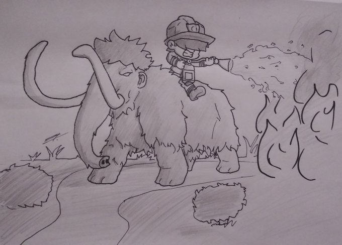 Día 24: Pibe bombero extinguiendo el fuego con un extintor encima de un animal recontra extinto, si no es seguir el tema no se qué es #Inktober #Inktober2021 #Inktober2021Day24 #InktoberDay24 #Extinct a
