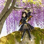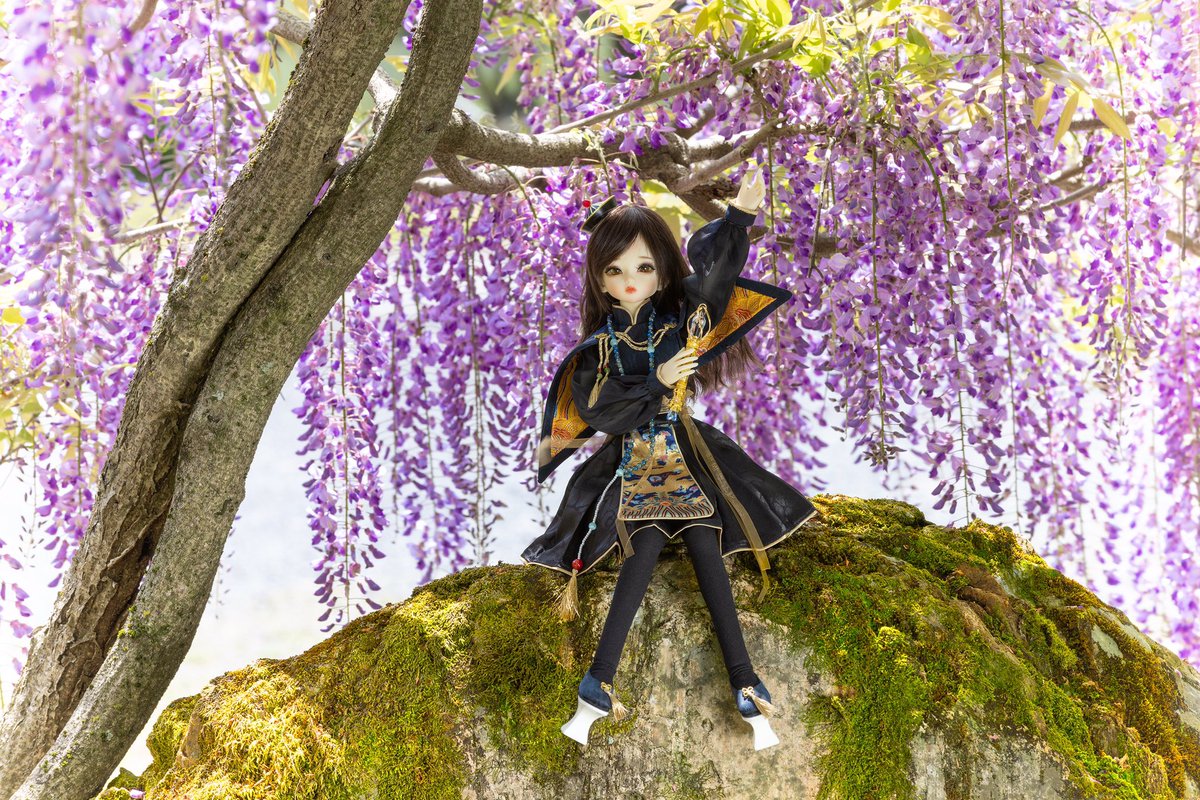 #今夜のドール撮影120分一本勝負 今夜のお題は【のぼる】〜過去〜 岩の上に登る、おてんば精霊ちゃん。藤の花を揺らす風を起こそうと、頑張って宝器を振りかざします😆 #BJD #ドールポートレート #Rhodonite #KidsSky #精霊