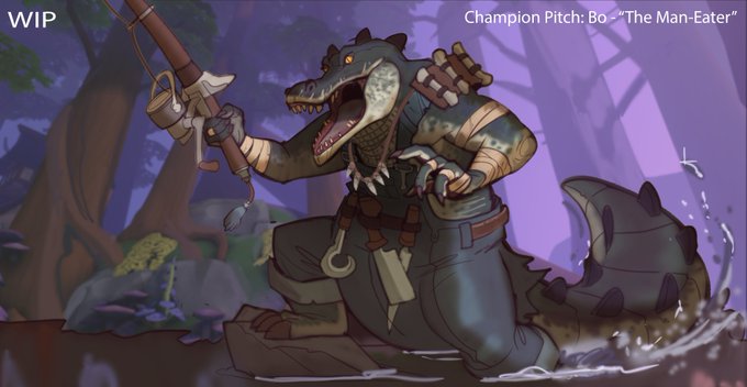 Another special fun-Friday art drop. The "Cajun-Gator" idea courtesy of @EvilMojoTrail that has floated around team discussion for quite some time. Very rough/quick stab at the idea. He uses a magical fishing-rod to reel in opponents for a snack! Enjoy!