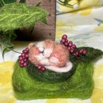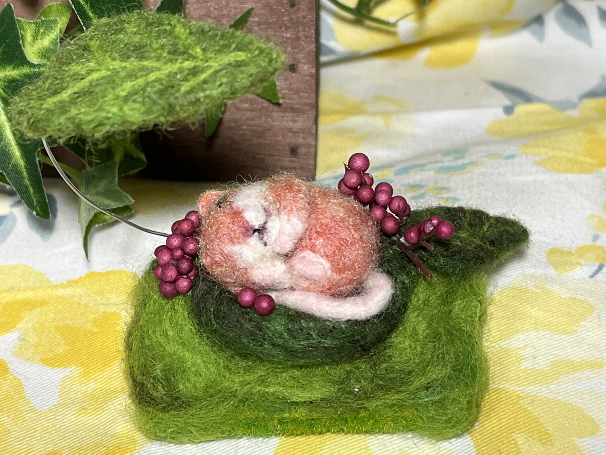 小さなヤマネの赤ちゃんがフカフカなベッドでお昼寝中です #羊毛フェルト #ヤマネ