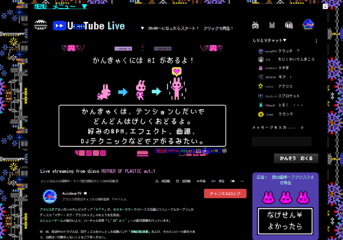 ディスコ「マザー・オブ・プラスチック」の熱い炎はぶつりてきな意味でもまだ消えていないですが、 今回の録画放送youtu.be/px_tWvttyDQもありますので、ちじくの周期に合わなかった方もぜひご覧ください!\(^^)/ -うさぎC #VirtualDJ #配信ライブ #pixelart #リモート #ドット絵 #VirtualReality