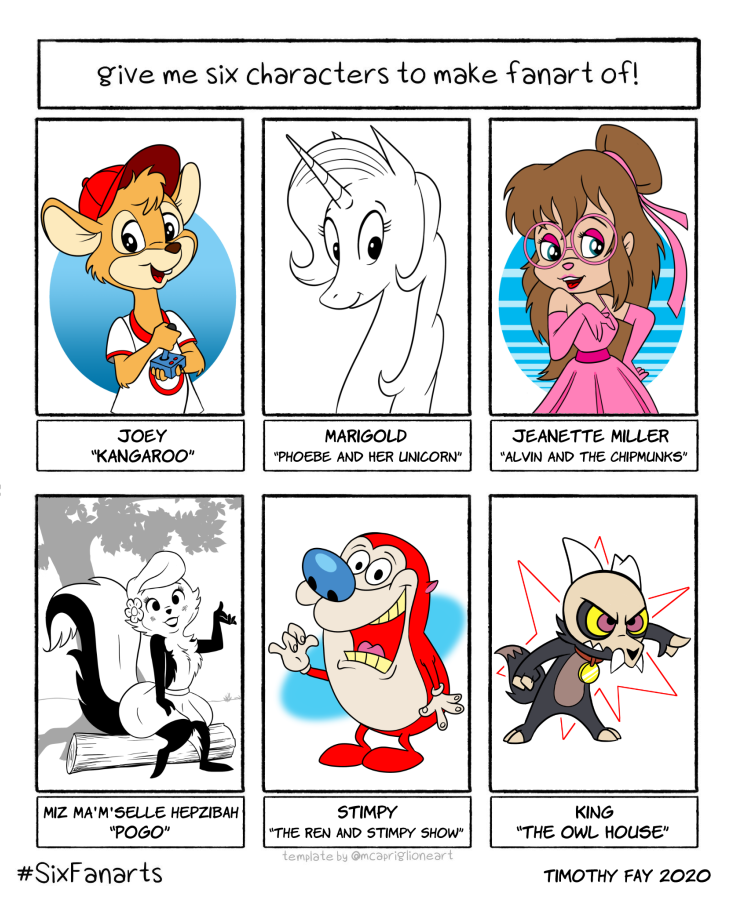 The latest art-rage is the #SixFanarts challenge and here is my entry! #Kangaroo #HeavenlyNostrils #Chipettes #PogoPossum #RenAndStimpy #OwlHouse