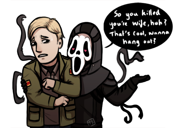 11/31 - The killer survivor He's not yours to torment Danny, leave the sad man alone. (idk how to draw James i'm sorry ._. ) #ghostface #dannyjohnson #jedolsen #jamessunderland #deadbydaylight #dbd #dbdfanart #silenthill