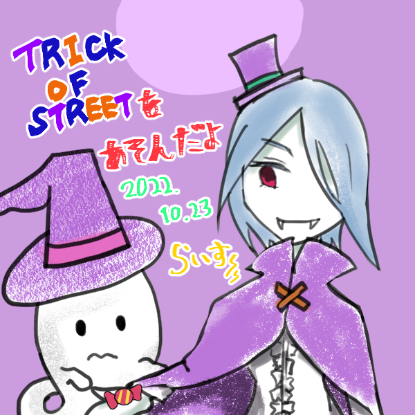 おしそさん【@soracdo 】制作のゲームを遊ばせていただきました! めちゃくちゃかわいい&ハロウィンらしくて最高でした♪ ハロウィン当日になるとガラッと雰囲気が変わる演出が素敵でした🎃 クリア記念にポゥくんとヴァンくん描きましたよ👻🦇みならいたちかわいい✨ #トリストHW twitter.com/soracdo/status…