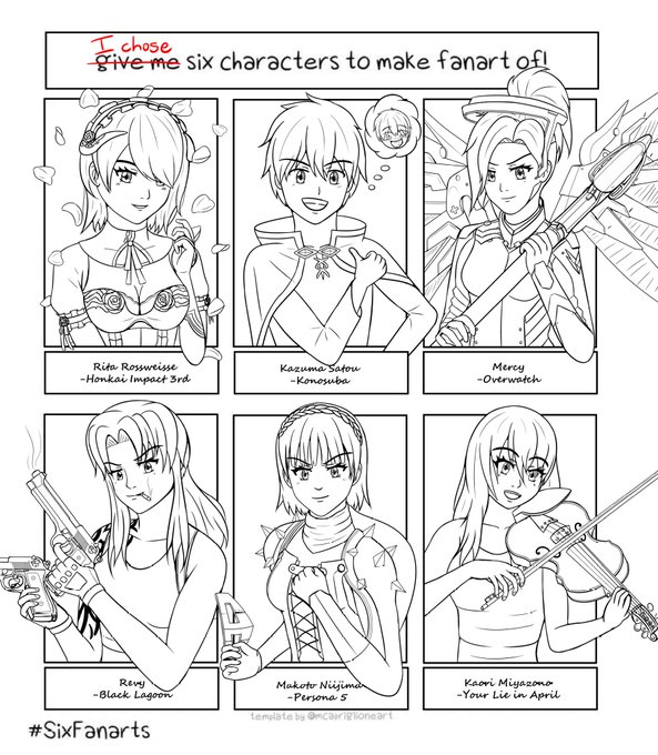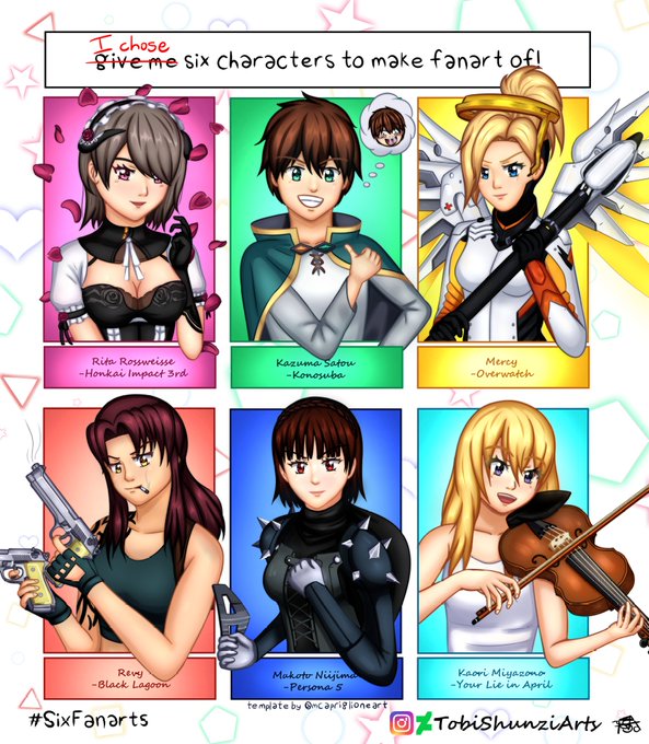 #SixFanarts Completed. Hadn't done any fan art in about 6 months so this was so much fun to do! 😁 #HonkaiImpact3rd #RitaRossweisse #Konosuba #KazumaSatou #Overwatch #Mercy #BlackLagoon #Revy #Persona5 #makotoniijima #YourLieInApril #KaoriMiyazono