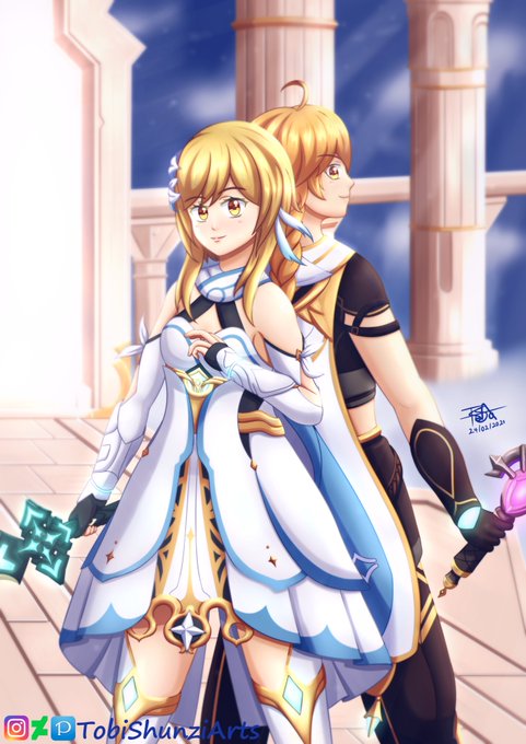 Travellers Aether and Lumine || Genshin Impact Fan Art O A fan art of the main characters Aether and Lumine. The first art piece I've completed mainly on stream. Really enjoyed this one! O O O #GenshinImpact #genshinimpactfanart #Aether #Lumine #AnimeArt