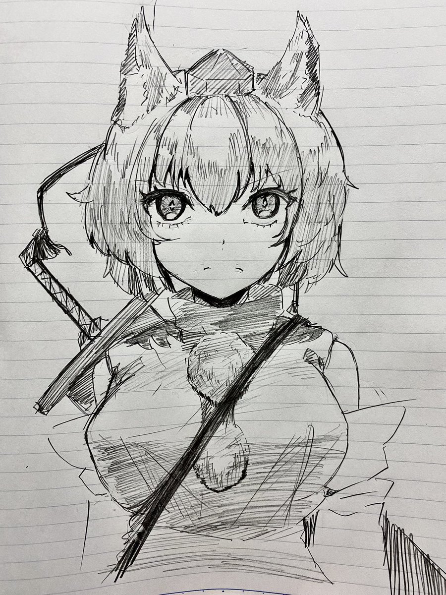 #深夜の真剣お絵描き60分一本勝負 犬走椛 50分 帰省中なのでアナログでやりました 久しぶりにやると難しい…