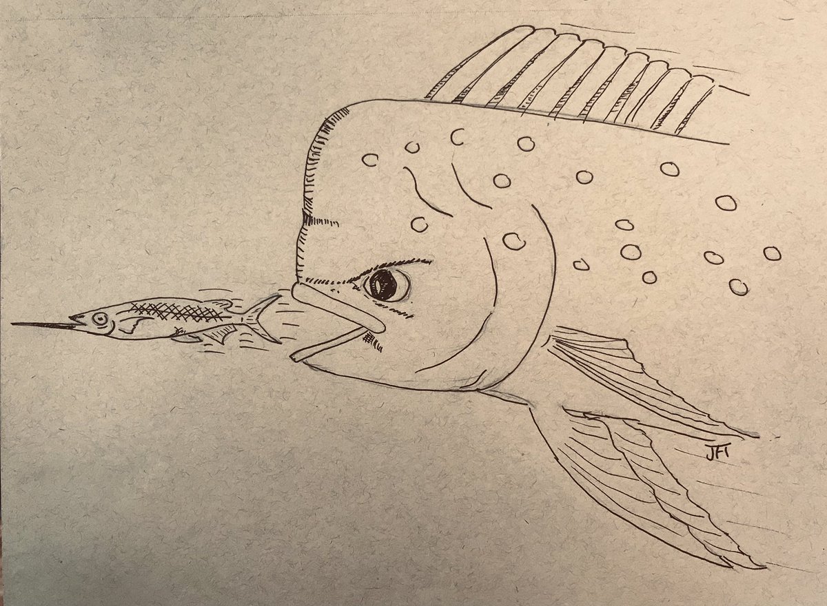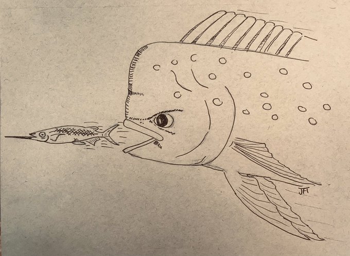 Just a quick ink sketch for #inktober2022 and #SundayFishSketch. Theme is #nest. It’s a stretch, but I went with “fit a smaller object inside a larger one” - ballyhoo about to be inside a mahi-mahi.