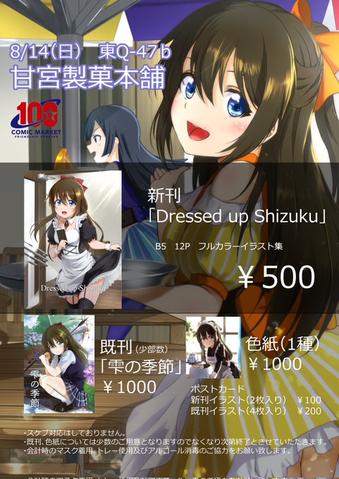#C100 8/14(日) 2日目 甘宮さん(@amamiya_draw)のブースでお手伝いをさせて頂きます! ↓お品書きはコチラ😎 会場参加される方は、是非東Q-47bへお越し下さい!✨