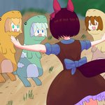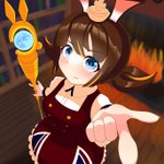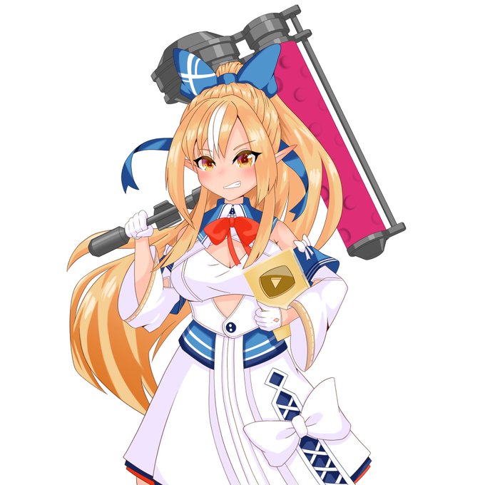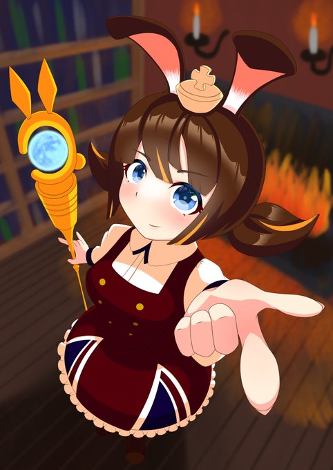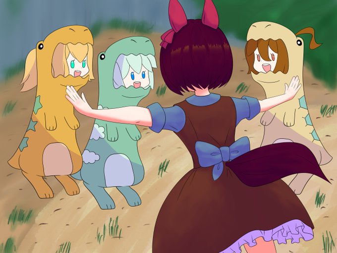 #今月描いた絵を晒そう 6月は2枚でした…💦 夢で見たシーンの再現と、フレアちゃん100万人記念です 恐竜の着ぐるみのアイデアが降りてきた時は高ぶりました✨ フレアちゃんのイラストで一番気合が入っているのは、金盾です✨