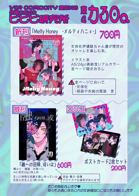 4 17 【1/29 閃華の刻42 新刊サンプル】 🎀Melty Honey🎀 ♡女体化伊達組ちゃんのファッションイラストブックです ♡A5/24p(表紙含)/フルカラー ♡会場頒布価格700円(予定) ♡全ページ描きおろし ⚠️全てのページにおいて、 ・女体化 ・衣装や髪型など容姿の捏造 が含まれます 23/01/20 21:12