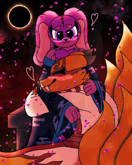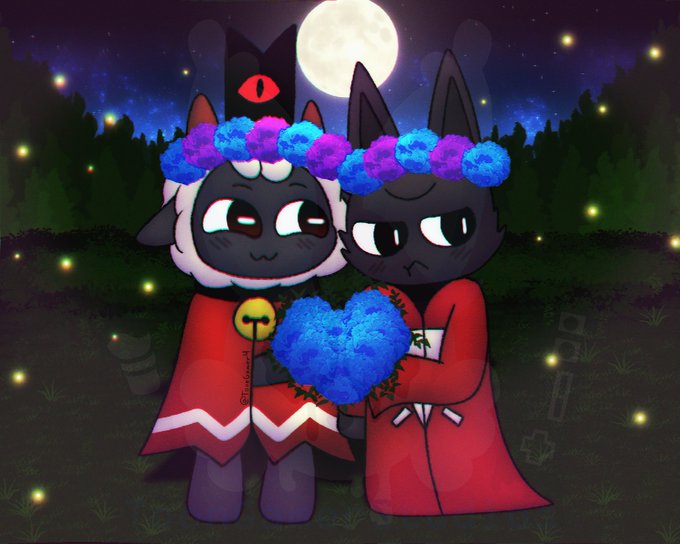 Lamb and Narinder snuggling on the moonlight with a lovely bouquet #CultoftheLamb #cultofthelambfanart