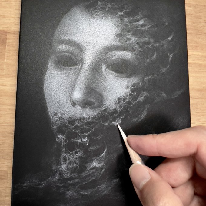 Working in progress. It’s a small piece than usual. White pencil drawings on the black paper stretched on the cradled panel. Panel size : 410 x 318 mm/16.14 x 12.52 in Model by Nanami STORE : Link in Bio #色鉛筆 #色鉛筆画 #darkart #drawing #art #pencilart #mementomori #fineart