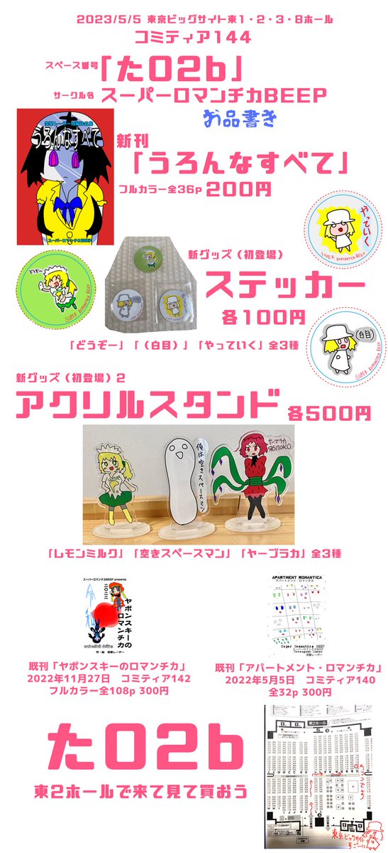2023年5月5日(金・祝) 東京ビッグサイト コミティア144 「た02b」 スーパーロマンチカBEEP 新刊「うろんなすべて」フルカラー全36p 200円 ステッカー 3種 各100円 アクリルスタンド 3種 各500円 これは お品書き です(白目) よろしくお願いします。 #COMITIA144 #コミティア144
