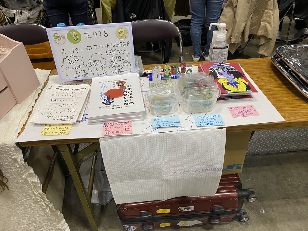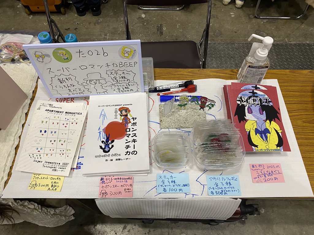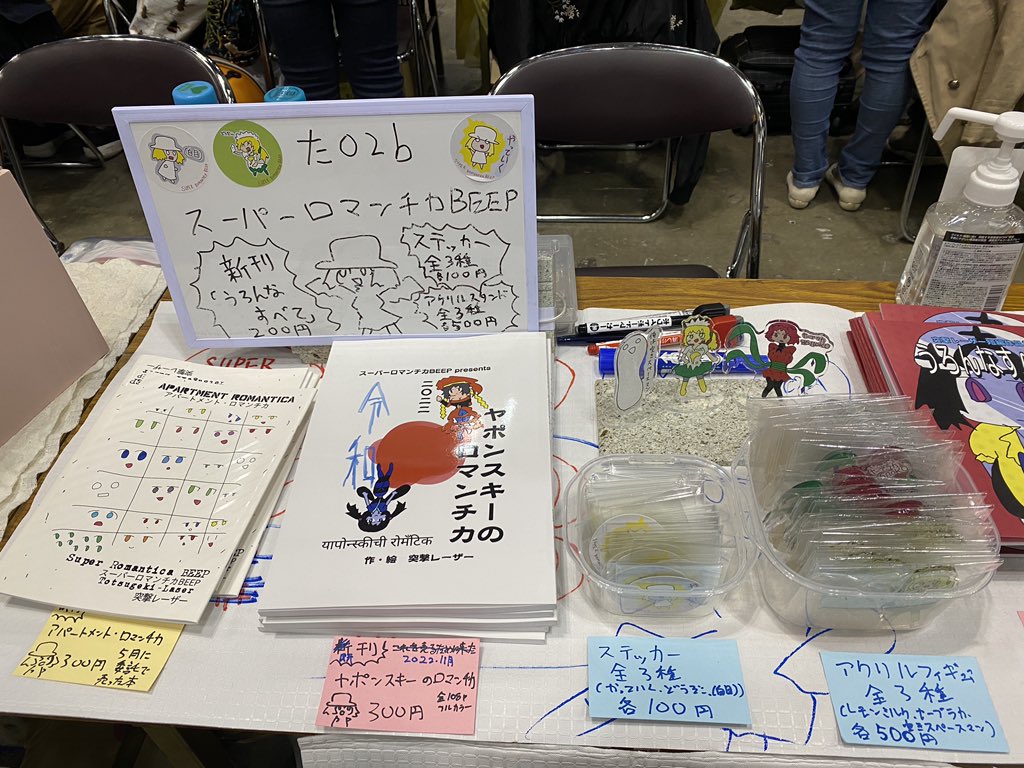 設営完了しました!!(白目) た02b サークル名 スーパーロマンチカBEEP 新刊「うろんなすべて」200円 新作ステッカー 各100円 新作アクリルスタンド 各500円 よろしくお願いします(白目) #コミティア144 #COMITIA144 twitter.com/totsugekilaser…