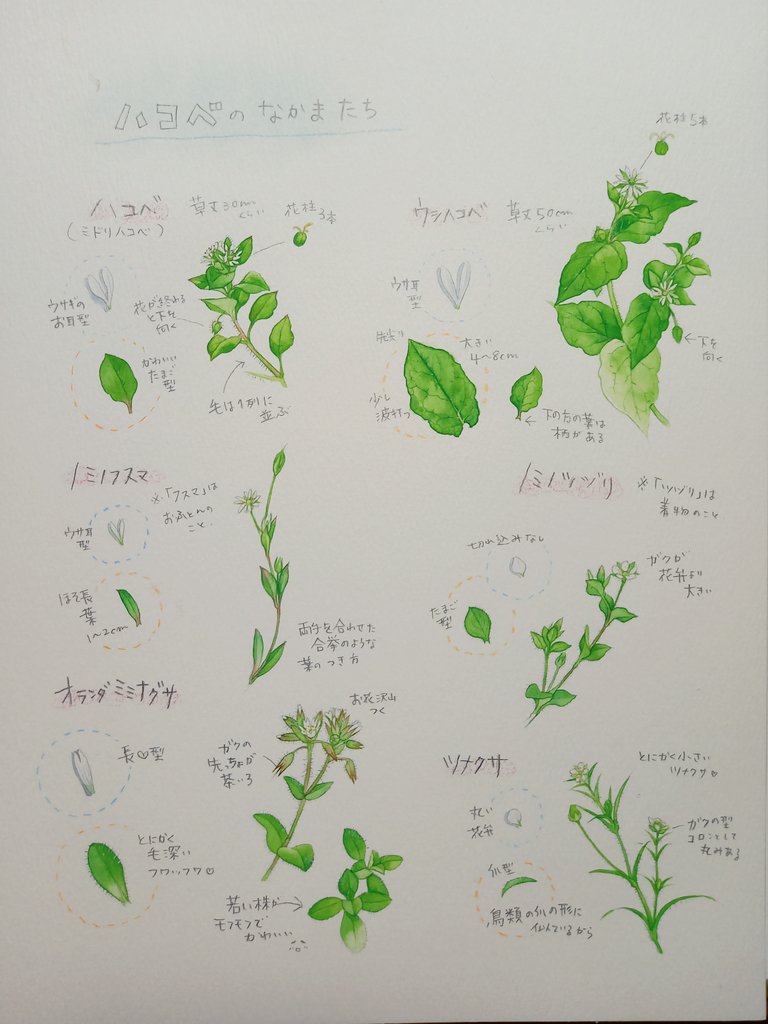 #ゴールデンウィークSNS展覧会2023 ~ハコベくらべ~ ハコベ属の小さななかま達🌱 似たような見た目ですが僅かな特徴の違いから見分ける事ができます🔎 #水彩画 #watercolor #植物画 #イラストレーター