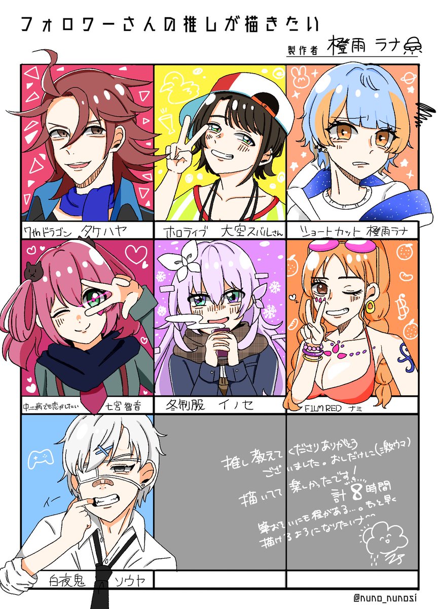 #フォロワーさんの推しが描きたい 配信お疲れ様でした!✨ 普段書かないキャラばっかりで楽しかったです!またやりましょう!縛ったりしたい! 8時間描いてたけどめっちゃ元気😄 次回配信は6日19時からメイドインアビス1期完全初見同時視聴!📺 それではさよラナおやすみ👋🏻🌙