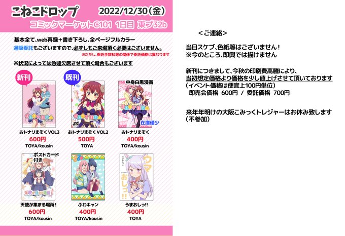 あなたのサークル「こねこドロップ」は、コミックマーケット101で「金曜日東地区 "プ "32b」に配置されました! @kousin22さんと合同でまちカドまぞく3冊目を出す予定です 間に合わなければゴメンナサイ… ※また今回よりサークル名を変更しております webcatalog.circle.ms/Perma/Circle/1… #C101WebCatalog