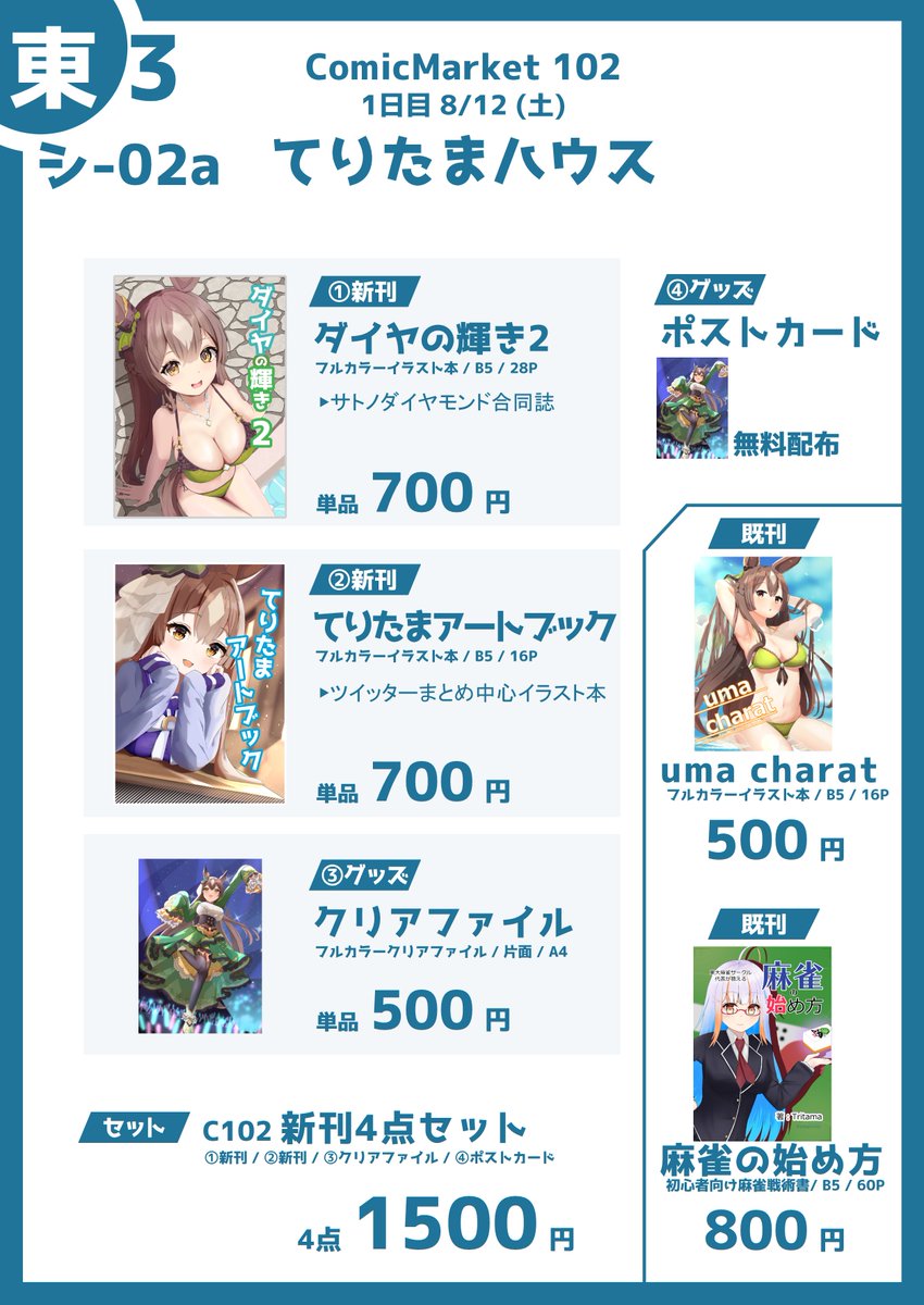 【 #C102 新刊のお知らせ①】 サトノダイヤモンド合同誌 総勢24人によるサトノダイヤモンドのイラスト合同誌です! サトノダイヤモンドの魅力がたくさん詰まったダイヤちゃん愛に溢れる本になりました🥰 コミケ当日は【1日目東3シ-02a】で頒布します!よろしくお願いします✋… twitter.com/i/web/status/1…