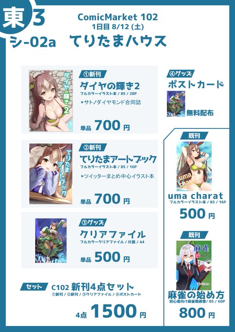 【 #C102 新刊のお知らせ②】 てりたまアートブック てりたまの今まで公開したウマ娘とブルアカのイラストに新規イラストを加えたイラスト本です! イラスト1枚ずつにコメントを載せており,どんな気持ちで描いたのかなどわかる本になっています!こちらもおすすめです! 通販予約はこちらから!… twitter.com/i/web/status/1…