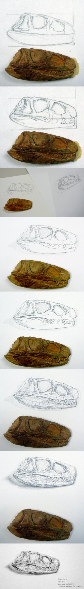 A throwback from 2013 - a progress series on how I did a drawing of a Euparkeria fossil cast. #SciArt #paleoart #paleoartprocess #drawing #scientificillustration #fossils