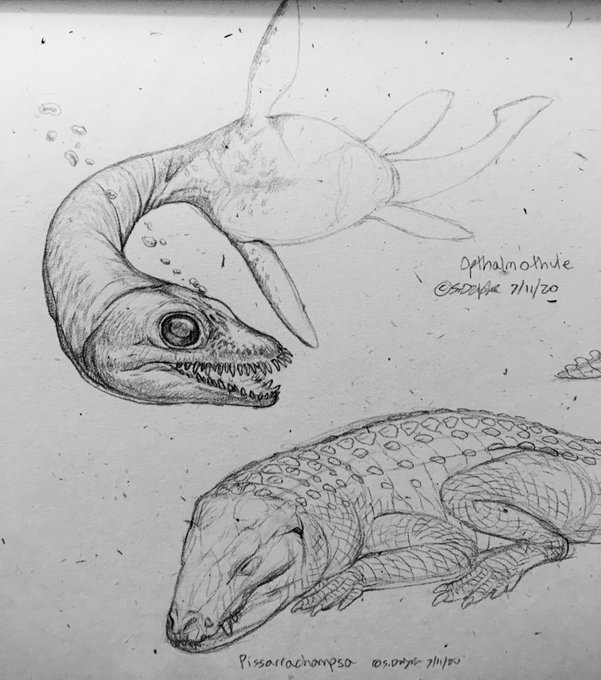 Opthalmathule and Pissarrachampsa from @JoschuaKnuppe’s #paleostream - yay weird scaly critters. #paleoart #sciart Drew a Zuniceratops but it is too sketchy.