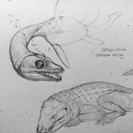 In accordance to character, I present this #MosasaurWeek and #SundayFishSketch double-whammy a week and a day late. XD Eonatator sternbergii and an early relative of the benthic fish Sorbinicharax verraesi. Blub blub! 💙 #paleoart #sciart #mosasaur #fish #scicomm