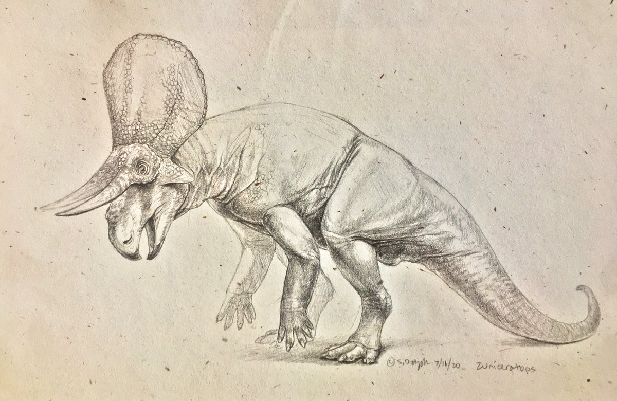 Zuniceratops christopheri, a small neoceratopsid, is a unique genus that may be a strong link in the evolution of Ceratopsidae. Found in New Mexico, dated to the mid Turonian of the Late Cretaceous. Only 3 foot/1 meter tall at the hips! #sciartportfolioweek #dinosaur #paleoart