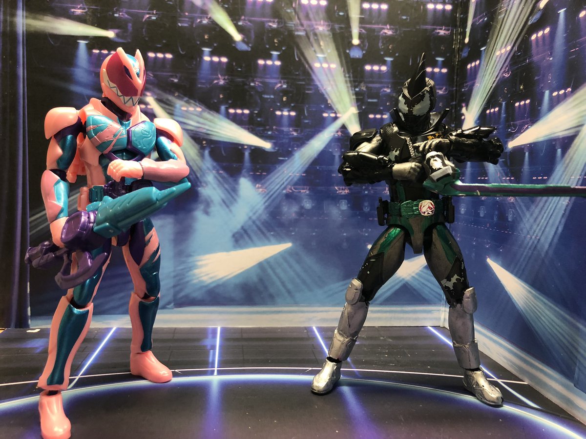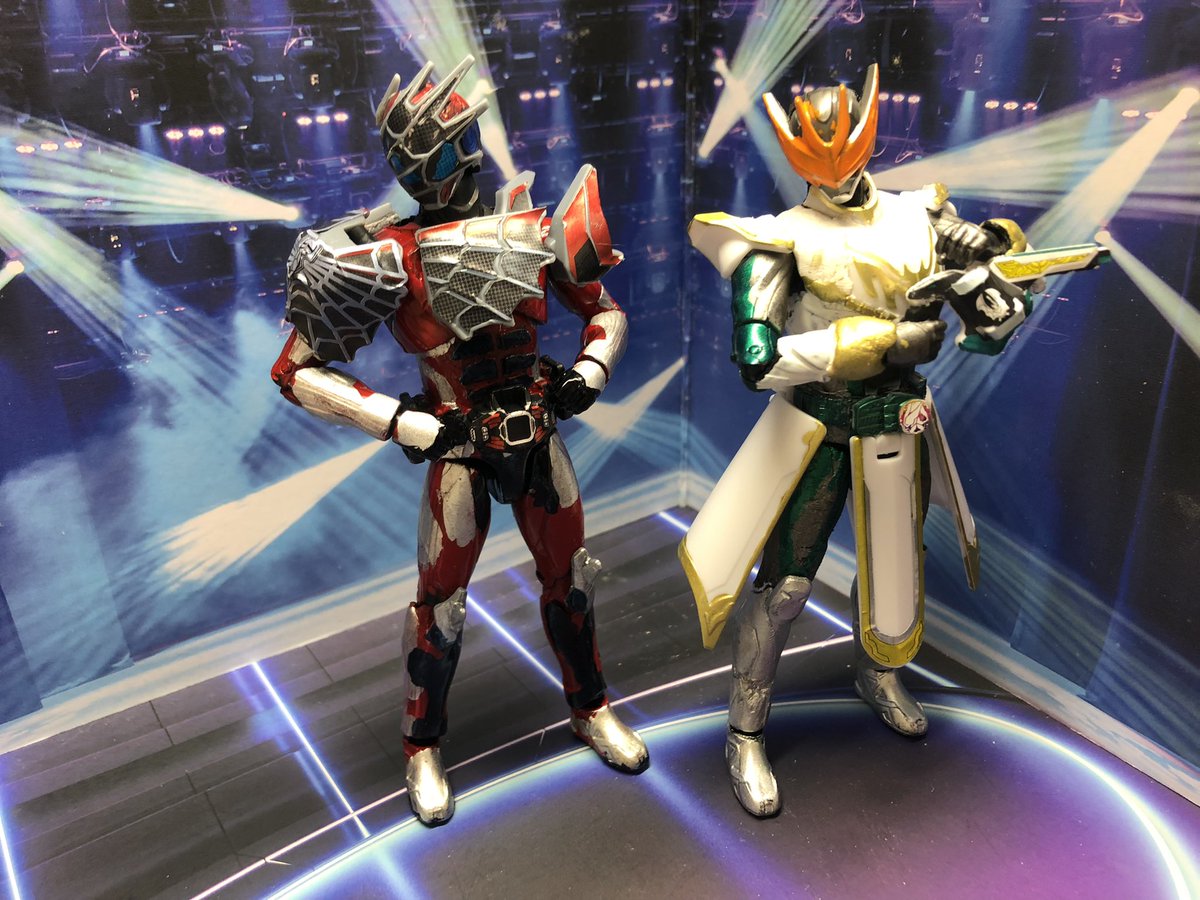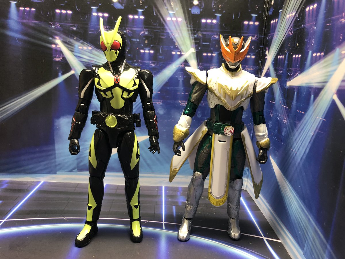 装動とRKFゼロワンを改造して仮面ライダーライブ作りました。2枚目は初登場回にやってたポーズのつもり。3枚目は比較。コレで最初の3人+aができた。早くジャンヌとバリッドレックスの装動が欲しい。 #ニチアサフィギュア改造部